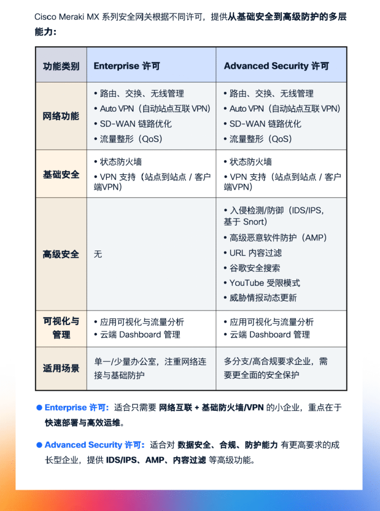 Enterprise 許可覆蓋路由/交換/無線管理、Auto VPN、SD-WAN 與基礎防火牆/VPN,適合注重連接與基礎防護的單一或少量辦公室;Advanced Security 許可在此之上增加 IDS/IPS(基於 Snort)、AMP、URL 內容過濾、威脅情報動態更新與搜索/視頻模式,面向多分支與高合規場景,可幫助企業升級“可用”。