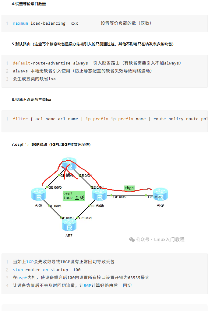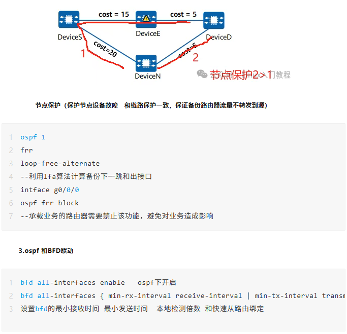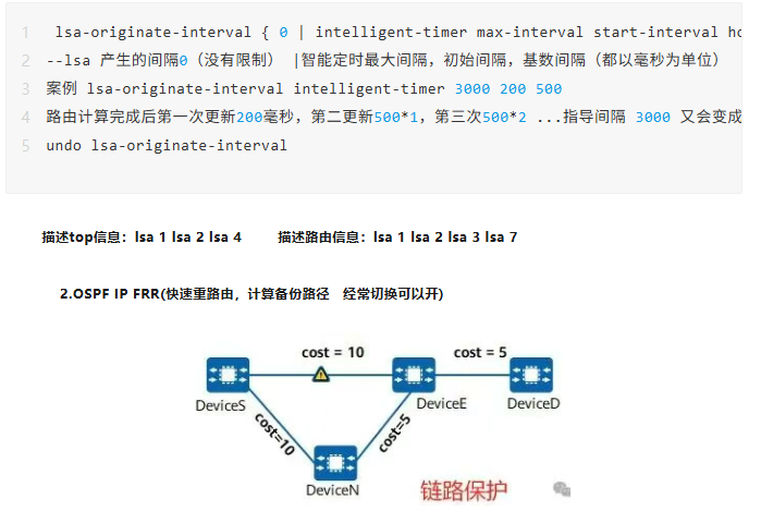 ospf的快速收斂用到如下擴展特性PRC(工作原理,當網路上路由發生變化的時候,只對變化的路由進行重新計算,最短路徑來更新路由),和智能定時器(當路由頻繁的更新時,可以對路由更新快速響應,也可以避免過度的佔用cpu,即控制收斂速率),同時,ospfft支援故障快速重路由)來實現備份連結的快速切換,也可以和bfd連動加速對連結的快速感知。